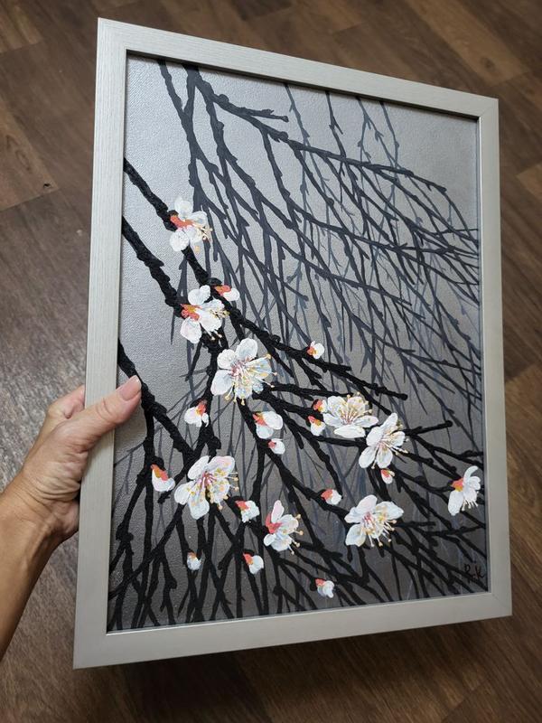 Природа оживає чарівністю весняного цвітіння на тлі спокійного сірого неба. Текстурні пелюстки створюють ефект реальності, ніби квіти зараз розквітнуть у вас перед очима, додаючи картині глибини, роблячи її ще більш витонченою та унікальною. Ідеальний вибір для створення затишку у вашому інтер'єрі. Розмір: 30х40 см Матеріали: полотно, акрил, текстурна паста