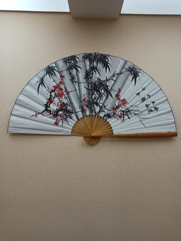 Китайский церемониальный веер. Веер двухслойный - верхняя часть роспись по ткани вручную, подкладка - специальная натуральная бумага. Створки и стрелы из натурального бамбука, бамбук лакирован. Длина вылета стрелы 820 мм. Предусмотрена петля для подвешивания на стену. Находился в дорогих чистых помещениях, в одних руках с момента покупки. Дорогая вещь для интерьера - не ширпотреб. Ширина в открытом состоянии 163, высота 90