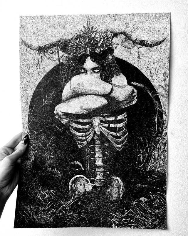 зображення міфічної, містичної жінки, в стилі готики та темного язичництва копія, формат а3, чорнило, техніка офорт