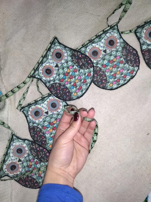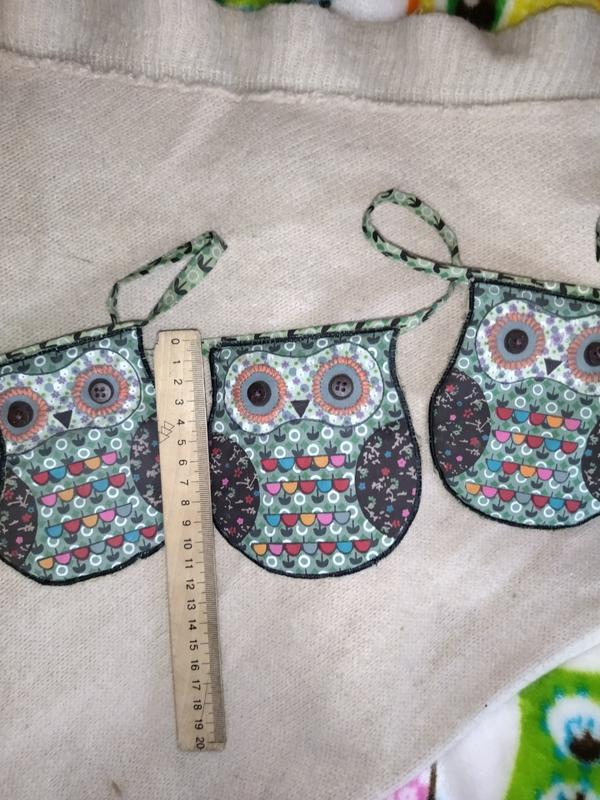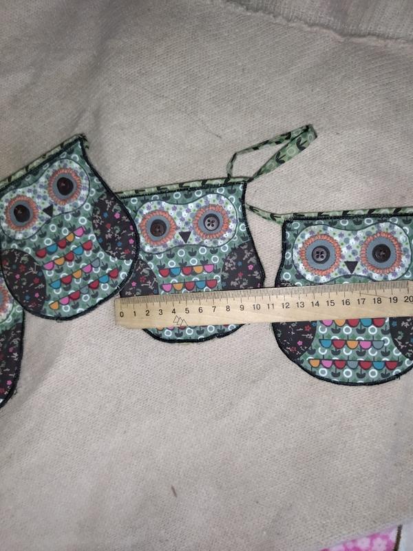 Красива гірлянда з 7 сов. Очі навколо обшиті, зроблені з гудзичків. Загальна довжина 2 метри 58 см. З боків є петельки щоб закріпити гірлянду. Виглядає дуже мило. Зроблена якісно. Можна як в нормативному так і у зал або на кухню. Колір постільний не яскравий, сильно не виділяється, але її добре видно. Перешлю будь поштою. Без торгу.