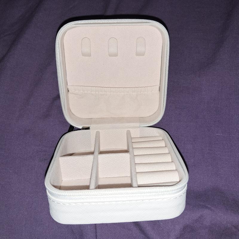 Скринька розміром 10×10×5 см білого кольору, має гарну блискавку, яка прослужить довго. Прикрас поміститися доволі багато, все можна зручно розмістити у відповідні розділи: для кілець, сережок та інших дрібних прикрас У наявності є така ж чорного кольору - дивіться інші оголошення в профілі
