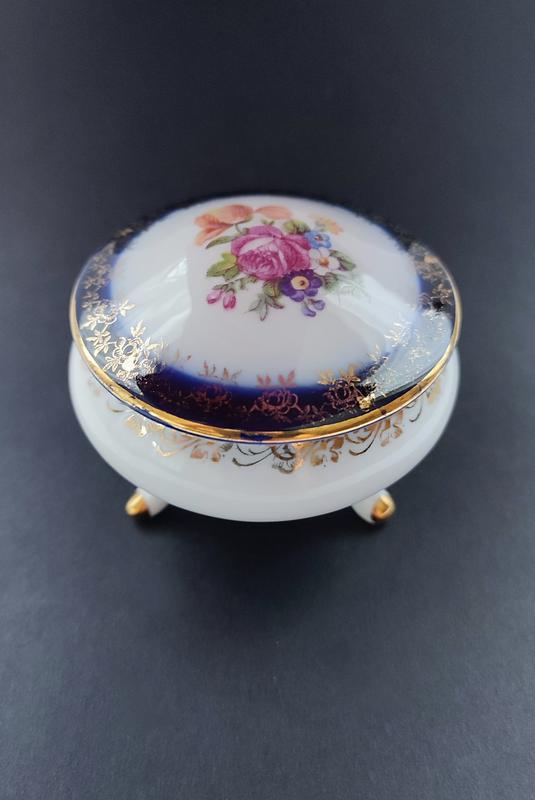 Вінтажна порцелянова скринька, шкатулка для прикрас на ніжках, шкатулка для дрібниць, імпорт Німеччина, на йкраща технологія китайської порцеляни. Фарфоровая бомбоньєрка зроблено в Германії. Дуже красива мініатюрна шкатулка для зберігання Ваших коштовних прикрас або просто для інтер'єру. Позолота, кобальт. 1970х років Розмір висота 6.5см, діаметр ширина 7см. Стан в ідеалі. Переглядайте мою сторінку тут ви знайдете багато цікавих порцелянових вінтажних речей і ще щось цікавеньке.