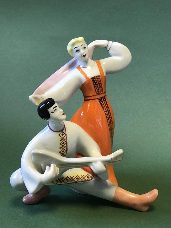 Статуетка "Танець", ЗХК Полонне. Порцеляна, розпис, золочення. Автор форми Бобик Микола Федорович, автор малюнка Шуляк Таїсія Датування: СРСР, 1970-ті роки. Маркування: надглазурне тавро Полонського порцелянового заводу. Розміри: висота 16,5 см, довжина 14 см, ширина 12 см. Стан прекрасний. Вартість 450 грн.
