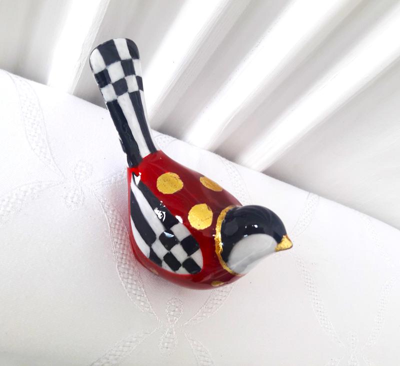Птаха, виготовлена з бетону методом лиття. Для більшої декоративності, ця статуетка розмальована в стилі Mackenzie-Childs. Це дуже веселий яскравий та декоративний стиль. Речі, декоровані в цьому стиоі, виглядають більш ефектними та помітними. Ця статуетка може бути прикрасою як для камінної полиці, журнального столу та полиці для різноманітних сувенірів та статуеток. Дуже оригінальний аксесуар для интер'єру, подарунок на День народження та інші милі свята.)) а також для любителів природи та орнітології. Птах вироблений із бетону, розмальований, та вкритий прозорою глазур'ю для імітації кераміки. При литті з бетону можуть виникнути бульбашки, нерівності та інш, що придасть шарму ручної роботи. Сподіваюсь, що така мила річ сподобається Вам.