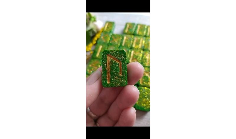 Рунічний комплект (Старший Футарк) виготовлений із натурального бджолиного воску зеленого кольору з блискітками.Має приємний медовий аромат 🍯В комплект входить мішечок для зберігання рун.