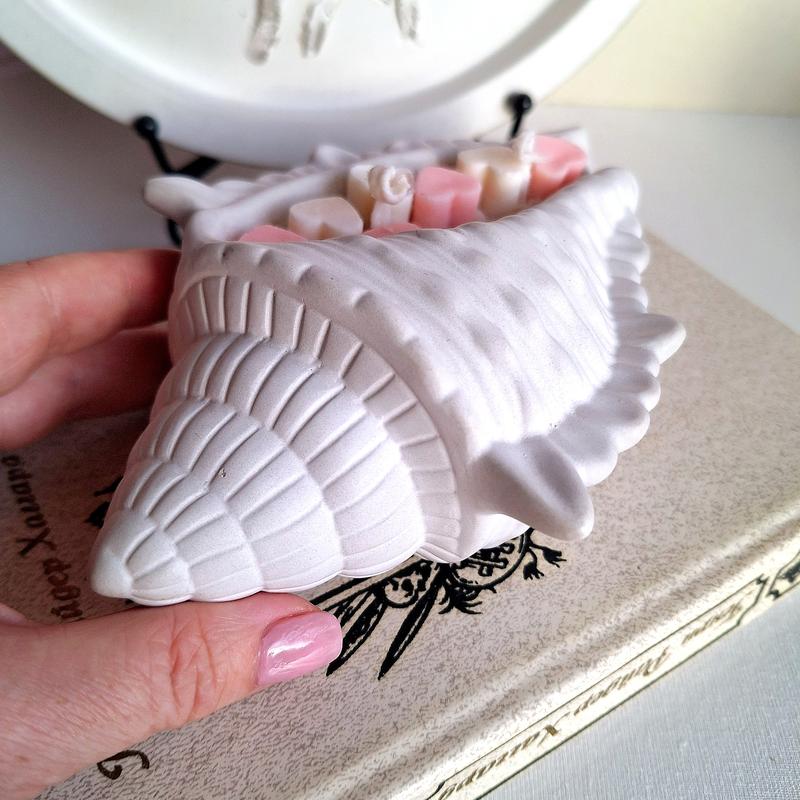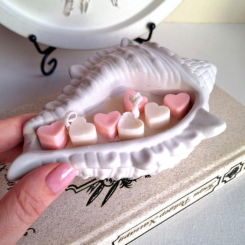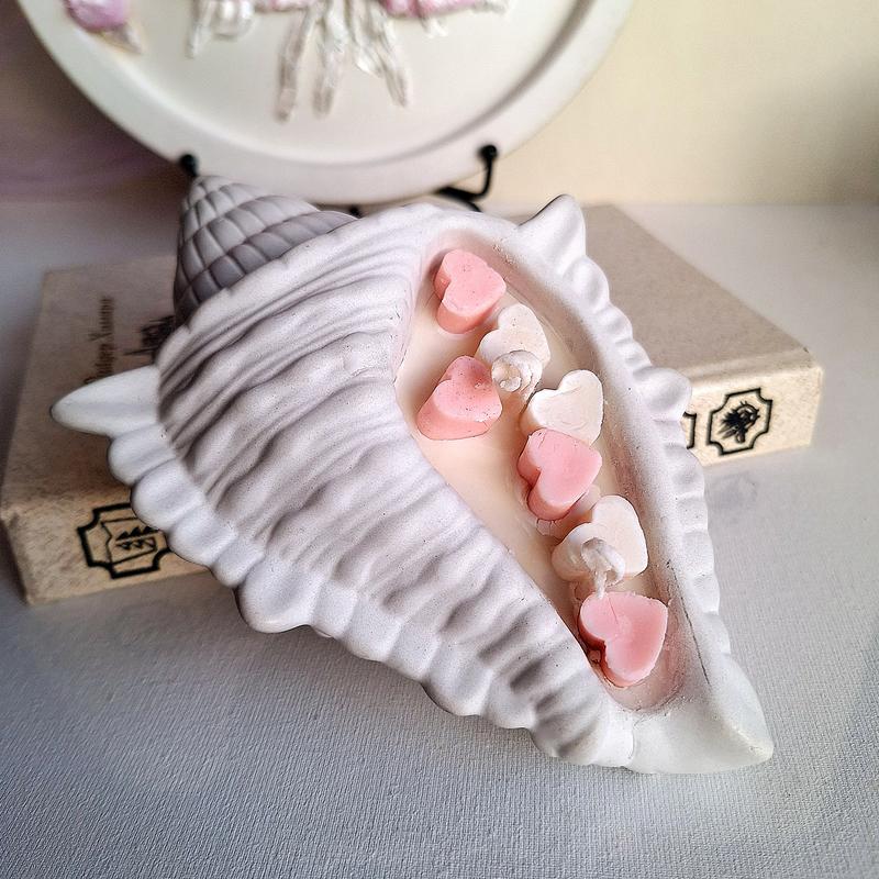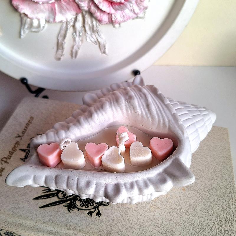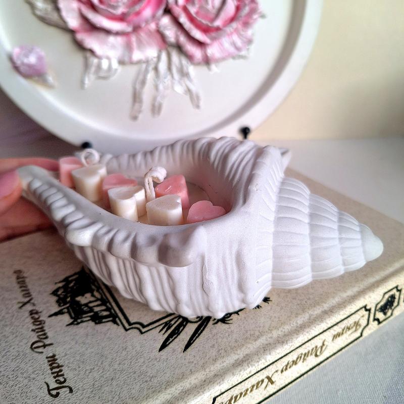 Велика мушля зі скульптурного бетону після може стати оригінальним органайзером для зберігання ключів, прикрас, різних дрібниць. Бавовняні гноти, натуральний соєвий віск з ароматом на вибір: