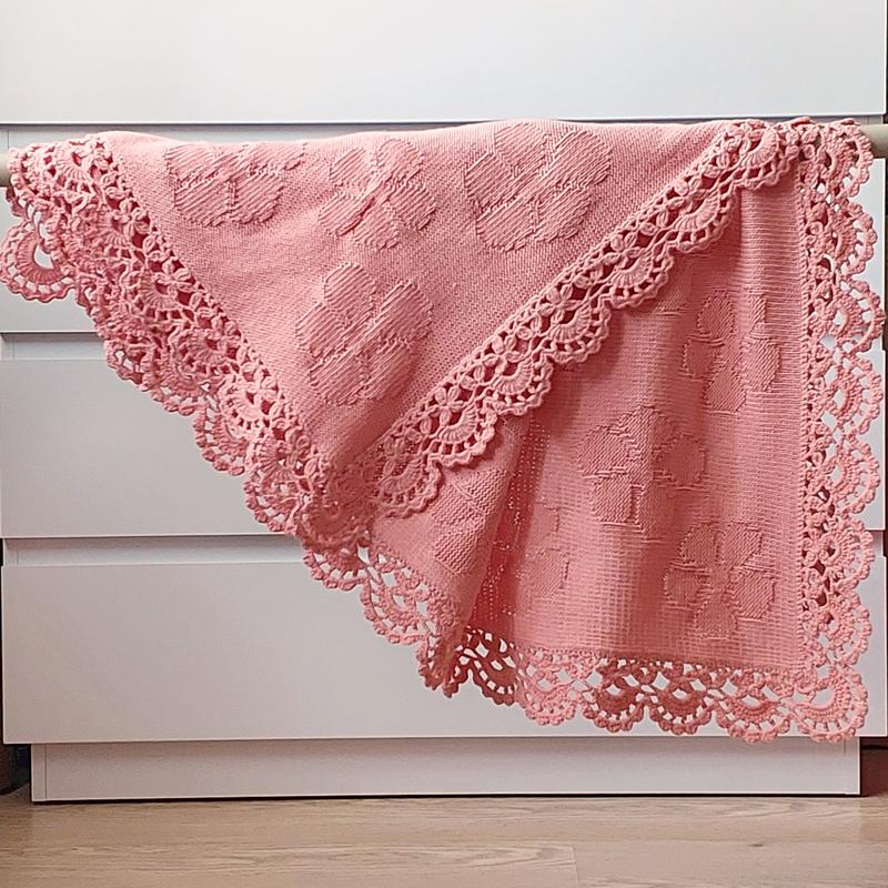 В'язаний бавовняний плед рожевого кольору. Розмір 80см × 100см. Двохсторонній плед, відсутня чітка лицьова і виворотня сторона. Зв'язаний з м'якої, ніжної бавовни так що з перших днів немовля може стати вірним супутником. ⠀ - це неймовірно святкова річ для виписки з полового будинку; ⠀ - для христин як Крижма ⠀ - на кожен ден під час прогулянок, подорожей, перших ігор; ⠀ - чудовий подарунок на відвідини малюка. Матуся вам подякує за такий подарунок. ⠀ Перевагою наших бавовняних пледів є: - здатність "дихати", що забезпечує проникнення повітря, виведення вологи. ⠀ - не електризуються і не викликають алергії. ⠀ - комфортні на дотик. ⠀ - прості в догляді. ⠀ - довговічні та зносостійкі. ⠀ - мають оригінальний дизайн. Вага пледу - 320г
