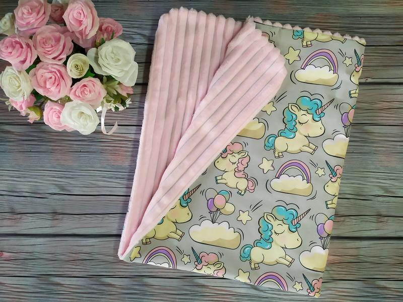 Плед з ніжного плюшу та бавовни, утеплений синтепоном. Також є варіанти літніх пледів без утеплювача. Розмір 97*77 див. Можна використовувати як ковдру в ліжечко, в коляску, а можна скласти як конверт на виписку. Гіпоалергенна тканина, а значить не викликає роздратування, алергію та інші неприємні відчуття при контакті з шкірою малюка