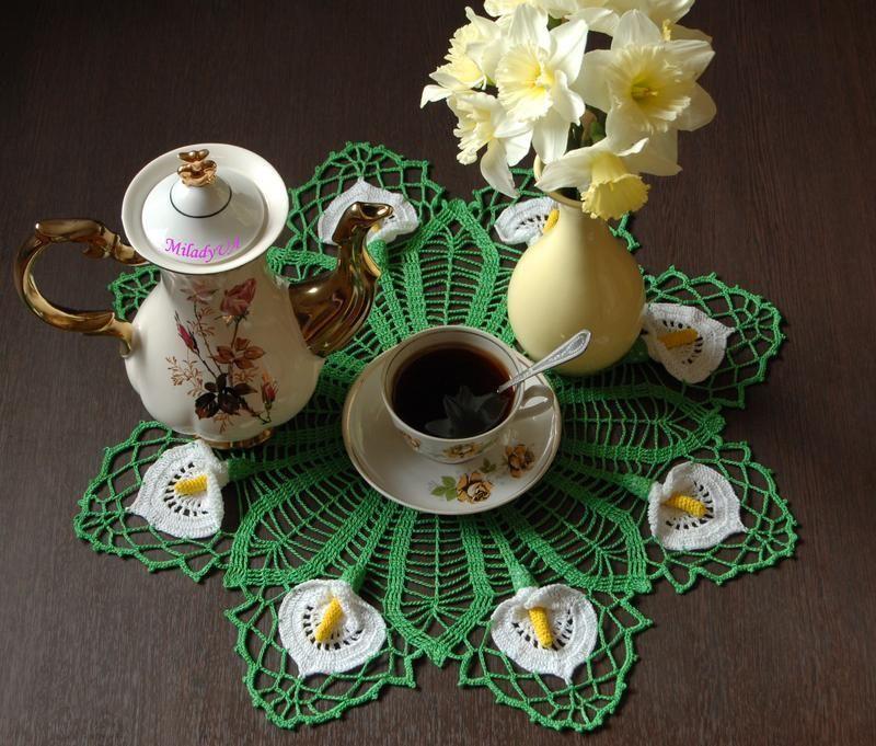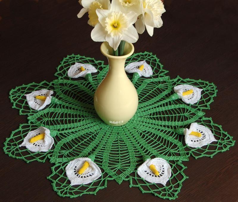 Велика ажурна серветка, пов'язана гачком за старовинним винтажному узору з бавовняних зелених ниток, прикрашена калами - ніжними білими квітами з жовтою серединкою. Розмір - 50 см в діаметрі. Ідеально для домашнього або дачного декору в стилі прованс, кантрі. Дозвольте собі мати завжди свіжі і нев'янучі кали! Велика ажурна серветка, в'язання пов'язана гачком за старовинним вінтажном візерунком з бавовняних зелених ниток, прикрашена калами - ніжними білими квітами з жовтою серединкою. Розмір - 50 см в діаметрі. Ідеально для домашнього або дачного декору в стилі прованс, кантрі. Дозвольте собі мати завжди свіжі і нев'янучі калі!
