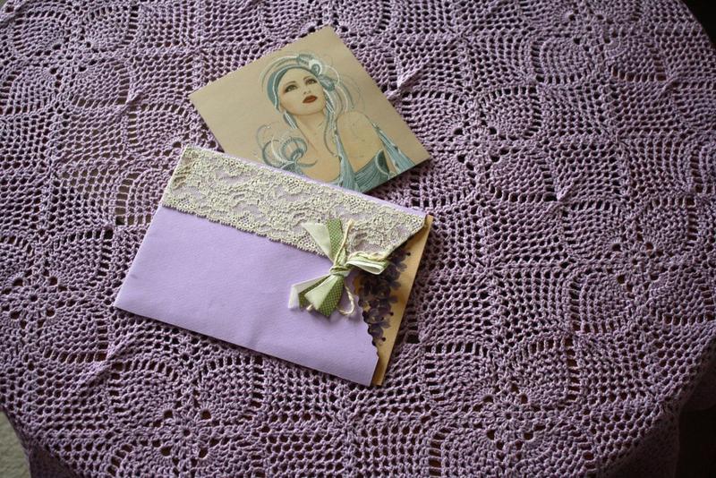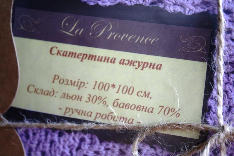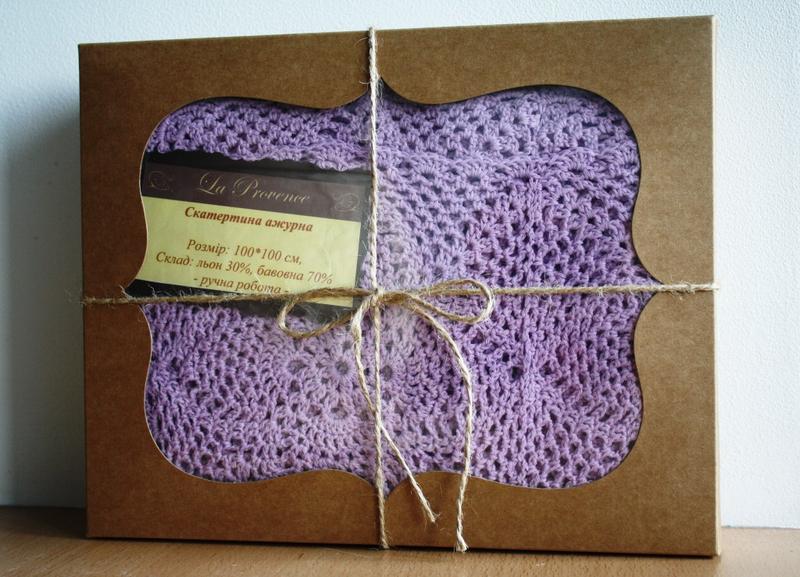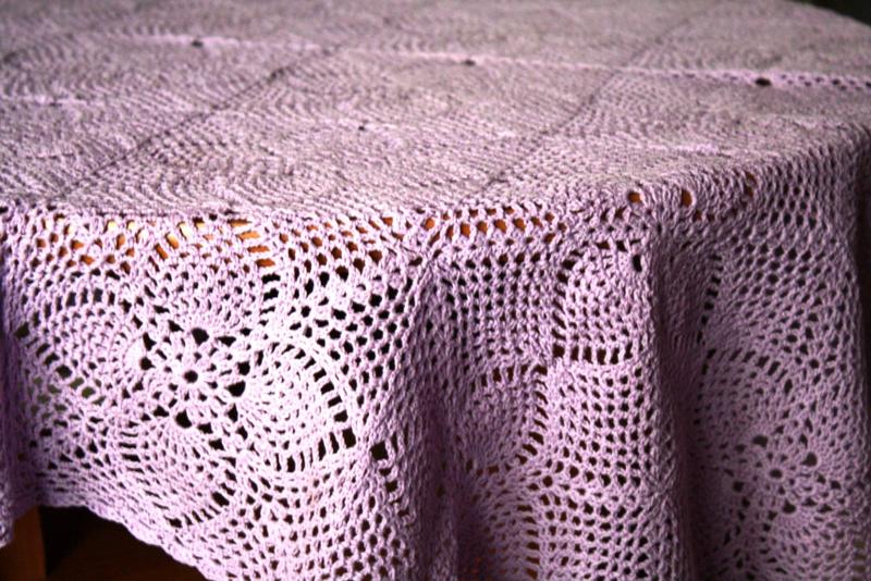 Скатертина бузкового кольору виконана гачком з ажурних мотивів. Ориганальная серветка для великого столу або чудове прикраса журнального столика!