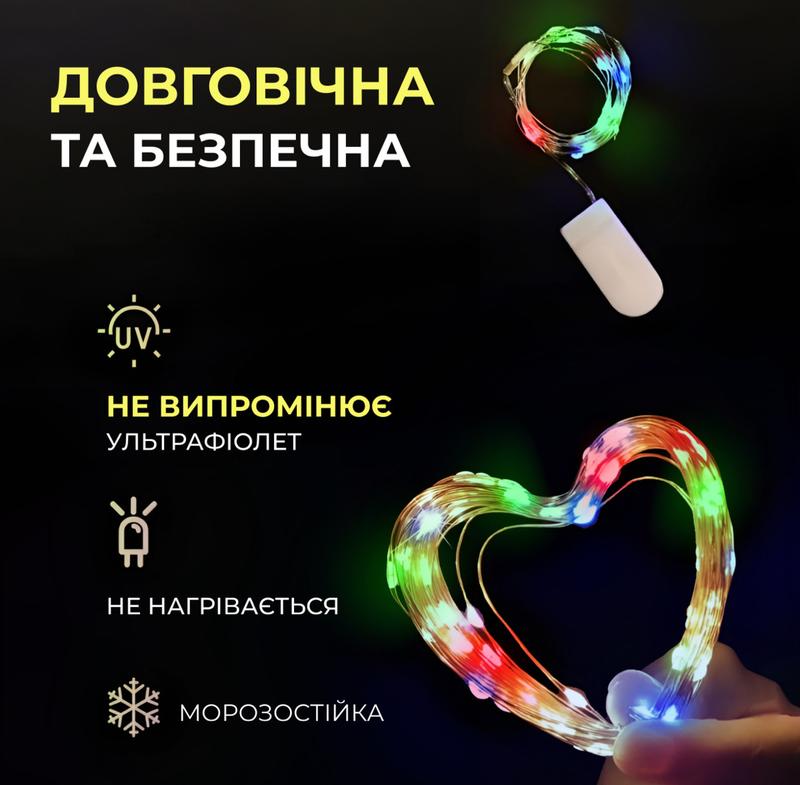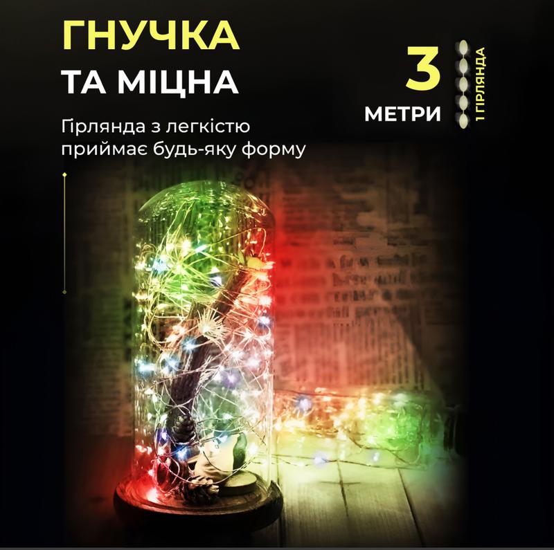 Довжина 3 м робить цю гірлянду універсальною: вона ідеально підходить для вікон, дверей, стін, картин, ялинок та інших поверхонь. Світлодіоди споживають мало енергії, а живлення від батарейок робить гірлянду автономною. Низька напруга робить її безпечною для використання в приміщенні.