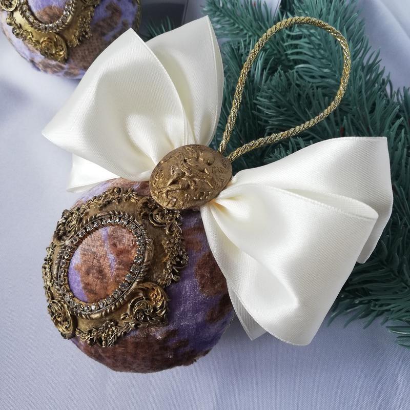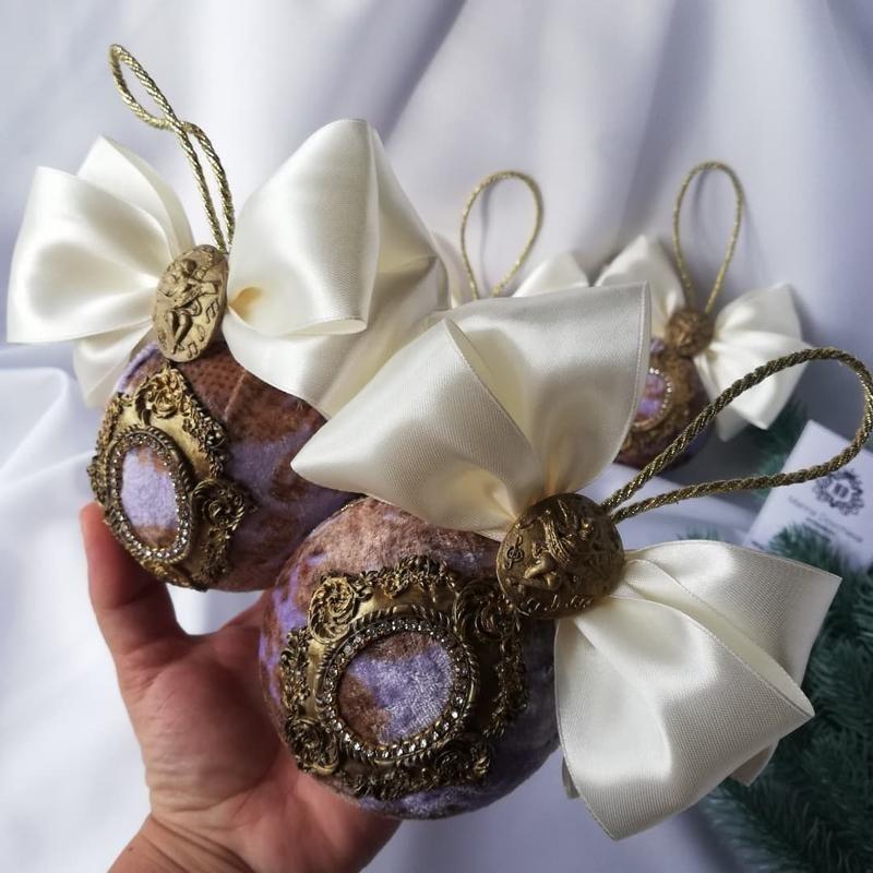 Ексклюзивний подарунковий набір новорічних куль. Повністю ручна робота. Ексклюзив. Оксамит, ліпнина, стрази, атласні банти. У наборі 4шт.d 8 див. Ціна 450 грн за 1 шт .Ідеальний подарунок.