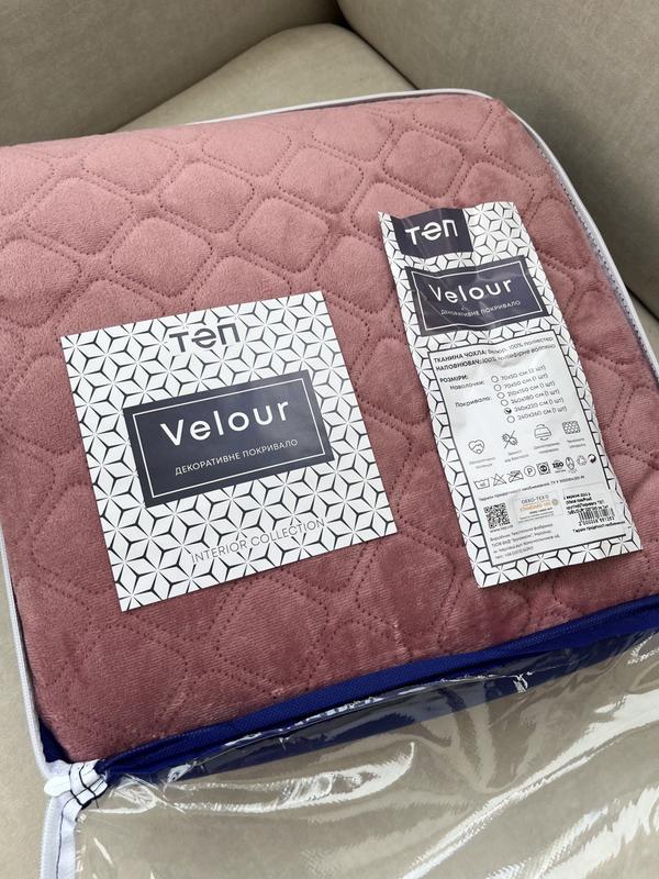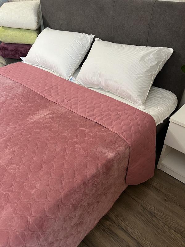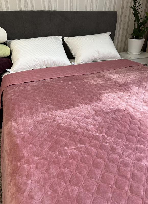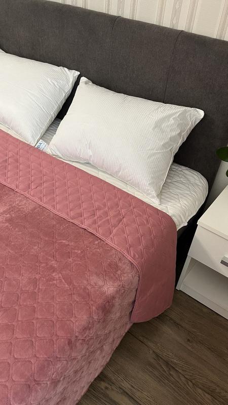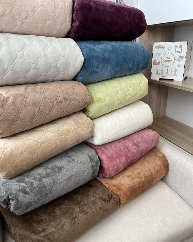 ✔️Покривало двостороннє. Одна сторона - велюрова тканина, що нагадує оксамит, дуже м'яка і приємна до тіла. Друга сторона – гладка мікрофібра. Покривало дуже приємне на дотик.