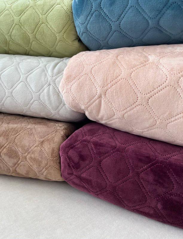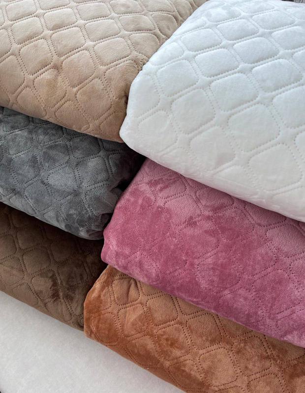 ✔️Покривало двостороннє. Одна сторона - велюрова тканина, що нагадує оксамит, дуже м'яка і приємна до тіла. Друга сторона – гладка мікрофібра. Покривало дуже приємне на дотик.
