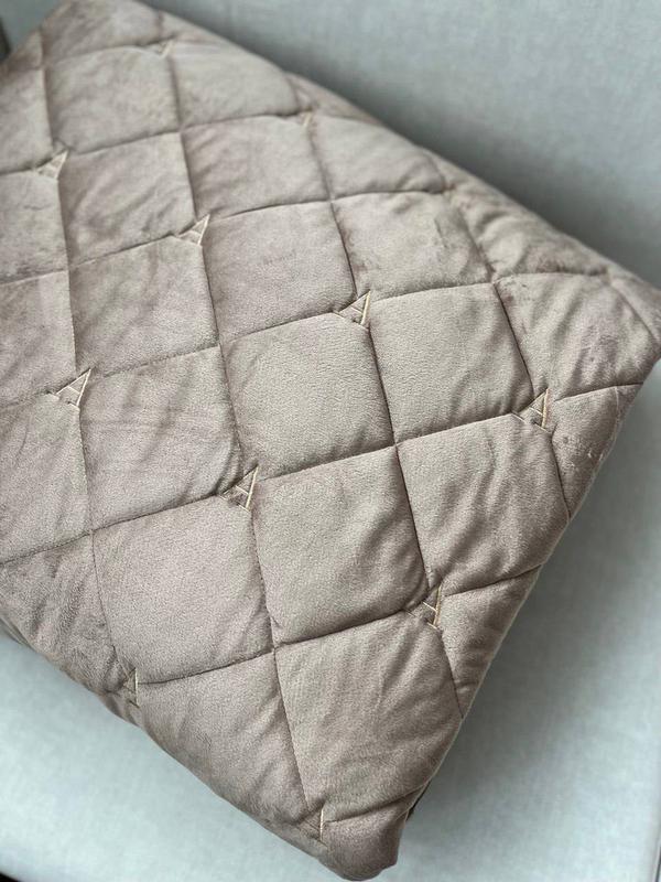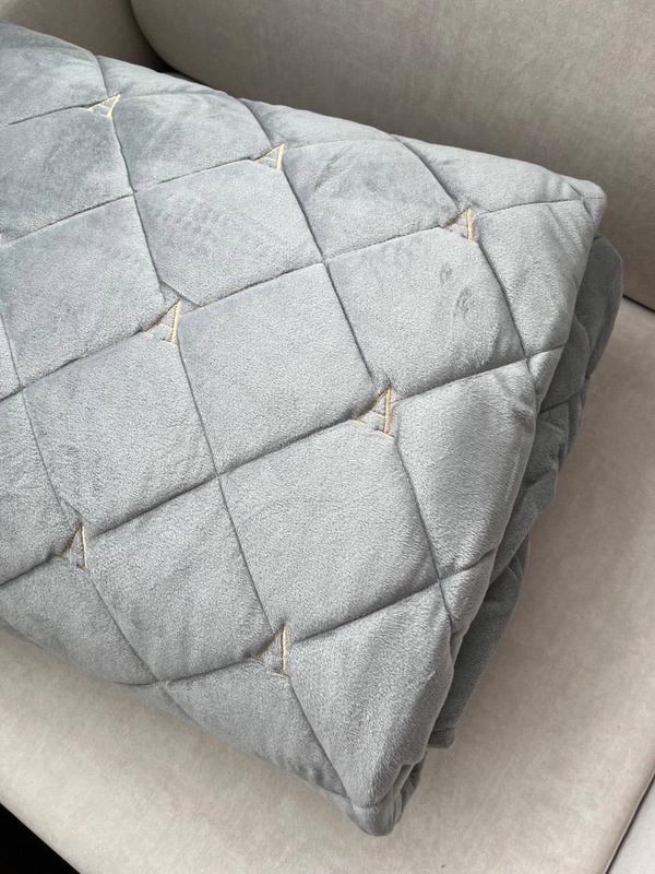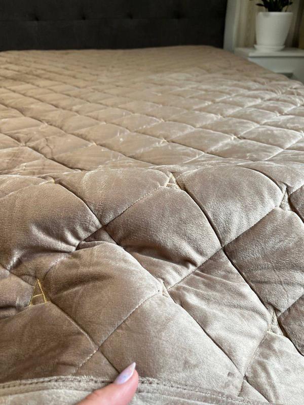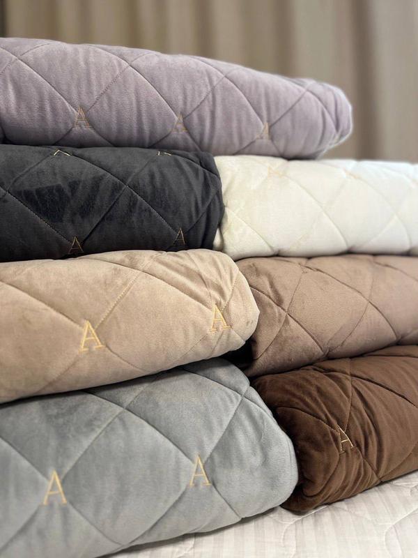 ✅Велюр — матеріал, який має ворсисту, оксамитову на дотик поверхню, досить щільний і дуже м'який. До складу входять натуральні та синтетичні волокна — 50% бавовна, 50% поліестер. Синтетичні нитки підвищують міцність і довговічність тканини. Натуральні волокна в складі тканини забезпечують повітропроникність і гіпоалергенність, не викликають шкірних подразнень. У процесі експлуатації покривало з велюру не сідає, мало мнеться й не розтягується.