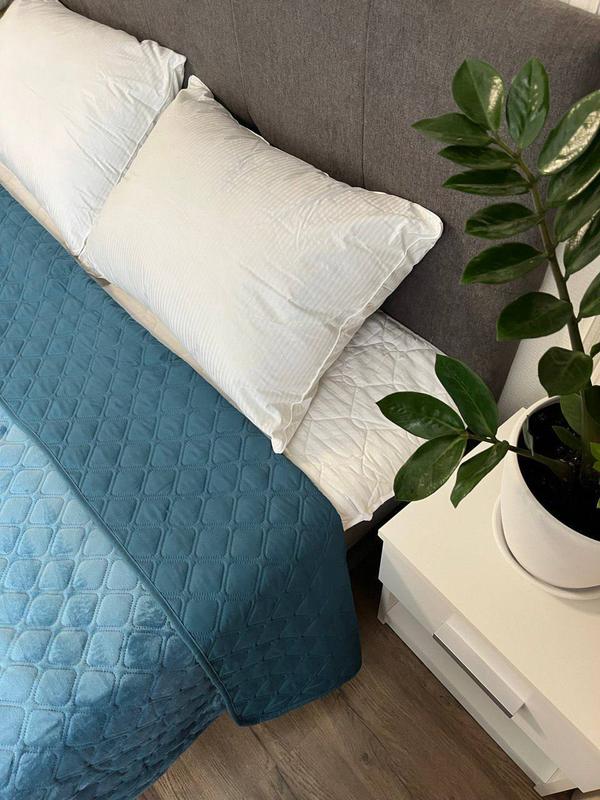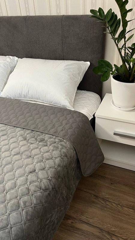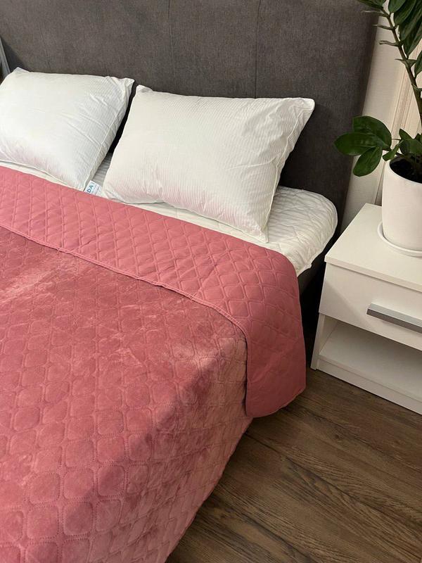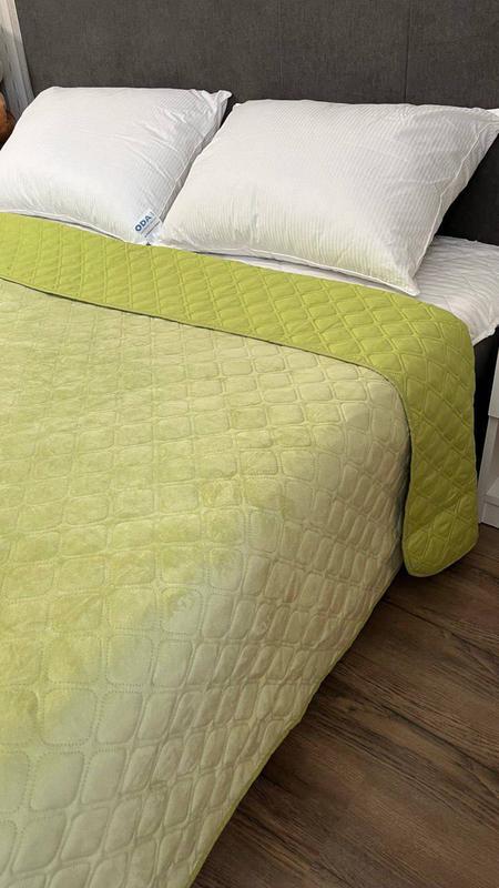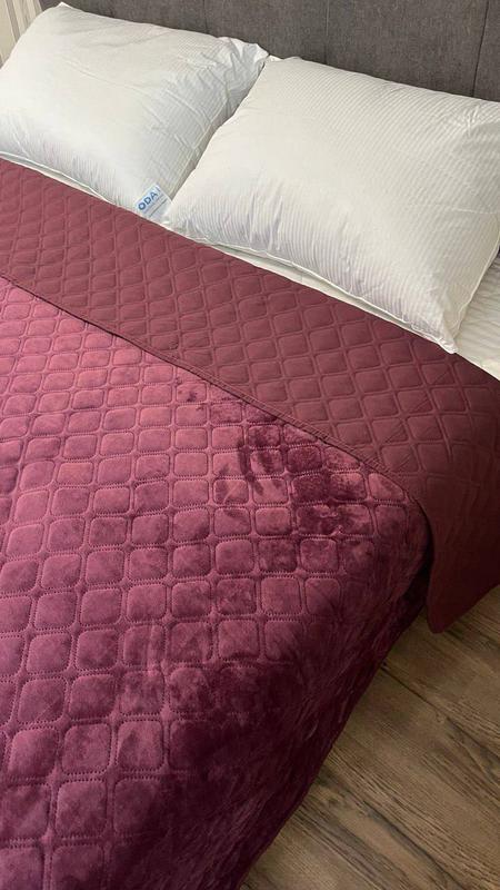 ✔️Покривало двостороннє. Одна сторона - велюрова тканина, що нагадує оксамит, дуже м'яка і приємна до тіла. Друга сторона – гладка мікрофібра. Покривало дуже приємне на дотик.