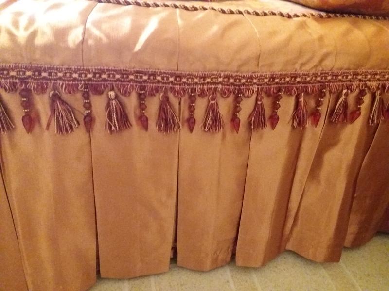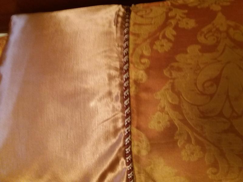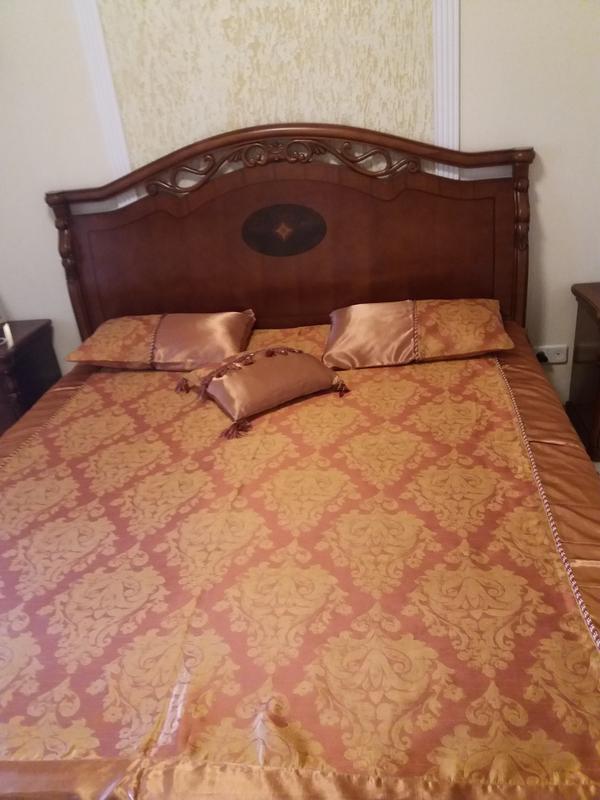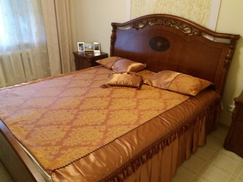 Покривало на ліжко 180×200 , отшивалось на замовлення. Тканина виробництво Бельгія та Франція . Розмір подушок 50 см × 70 див. Є штори в комплект з ламбрикеном.