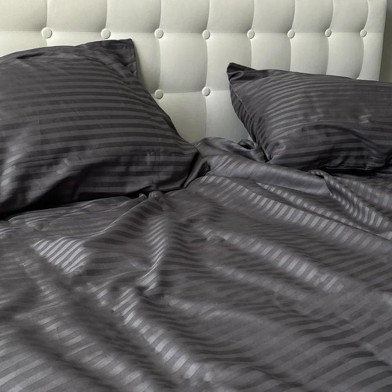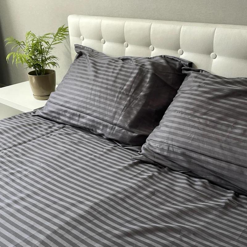 За своїми властивостями Сатин Страйп дуже близький до жакарду, і основна особливість такої тканини полягає в її малюнку: характерні смуги виходять не шляхом друку, а за рахунок особливого переплетення ниток. При виробництві тканини Сатин Страйп використовуються тільки екологічно чисті барвники, які наносяться не на готовий матеріал, а використовуються для забарвлення окремих ниток перед плетінням.Тонка, але міцна, з особливим шовковим блиском. Тканина складається виключно з натуральної бавовни без домішок, відрізняється відмінною якістю. Величезна різноманітність кольорів від спокійних до яскравих і зухвалих просто вразить вашу уяву, а також надихне на сміливі експерименти при облаштуванні своєї спальні.
