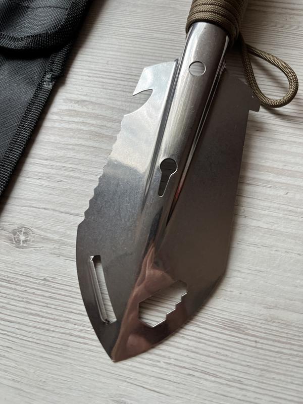 Лопата туристична виготовлена зі спеціальної сталі і має підвищену міцність і корозійну стійкість. Рукоятка багатофункціональної лопати обгорнута шнуром (паракордом) для збільшення комфорту та міцного зчеплення (шнур також може бути використаний у підручних цілях).