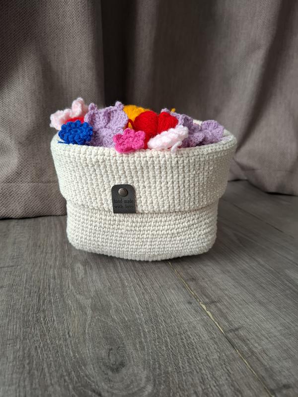 Корзинка для зберігання в'язана крючком з натуральних матеріалів. Форма квадрата, розмір 15х15, висота без відверту 20см. Завернути можна на будь яку зручну висоту.