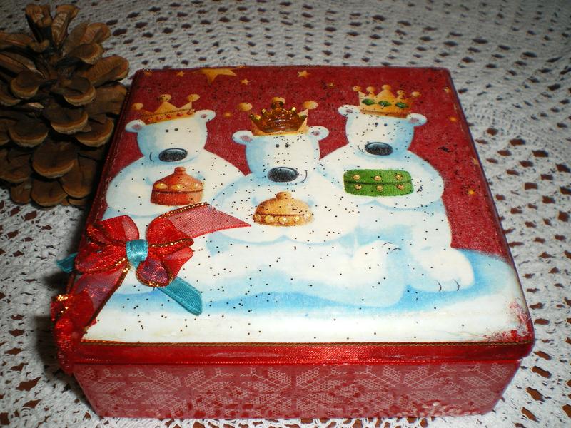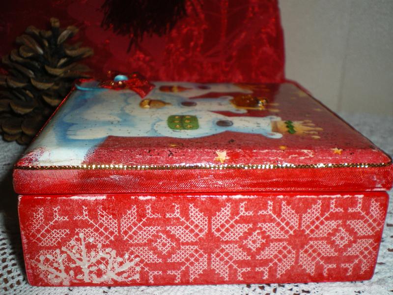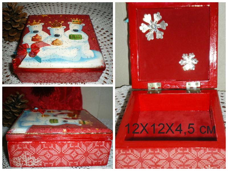 Скринька, коробочка для зберігання прикрас або різних дрібниць. Розміри - 12Х12Х4,5 см. Матеріал - дерево, акрилові фарби, лак, декупажний декор 3D, всередині велюрова папір. Чудовий подарунок до Нового року! Повністю ручна робота, в одному примірнику.