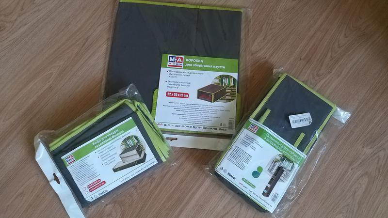 Набір кофрів для зберігання речей з 3 одиниць Колір: сірий (сіро-коричневий) з яскраво-салатовим кантом. Матеріал: спанбонд (нетканий матеріал). Набір складається з: 1. Коробка для зберігання взуття або будь-яких інших речей. Виготовлена з нетканого матеріалу (спанбонд), картону, ПВХ. Тверді стінки. Є прозоре віконце. Розмір 22х35х12 див. 2. Кофр для ковдри, подушки, ліжка, пуховиків і т. д. Розмір: 60х45х30 див. З м'якими стінками (при необхідності компактно складається) і прозорим віконцем. Кофр - найзручніший спосіб тривалого зберігання одягу, подушок, ковдр та пледів. Речі надійно захищені від пилу і негативного впливу навколишнього середовища. 3. Полиця-органайзер з висувним ящиком. Призначена для дбайливого і компактного зберігання речей. Полиця-органайзер виготовлено з полімерного нетканого матеріалу, який характеризується зносостійкістю. Конструкція органайзера являє собою 9 полиць і висувний ящик. Органайзер оснащений кріпленням для штанги, що дозволяє його використовувати в гардеробній і шафах. Розміри полиці-органайзера: 15х30х128 см, в складеному вигляді органайзер займає мало місця. Дуже компактний і місткий! Можна повісити в будь-якому шафі, гардеробі, комори.