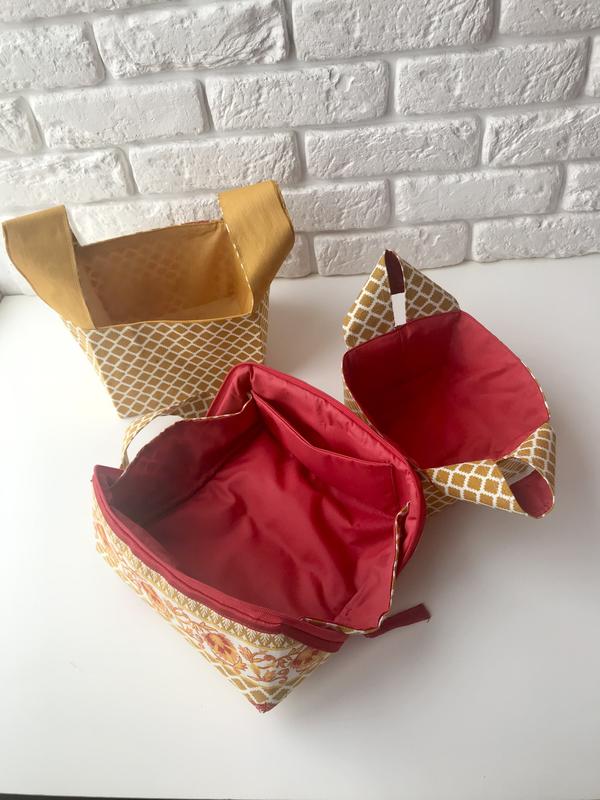 Текстильна кошик гірчичного кольору з червоною підкладкою полегшить порядок і організацію мелочовки в будинку . Такі зручні органайзера можна використовувати для будь-яких дрібниць { косметика, тюбики і баночки, нитки 🧵, гумки}