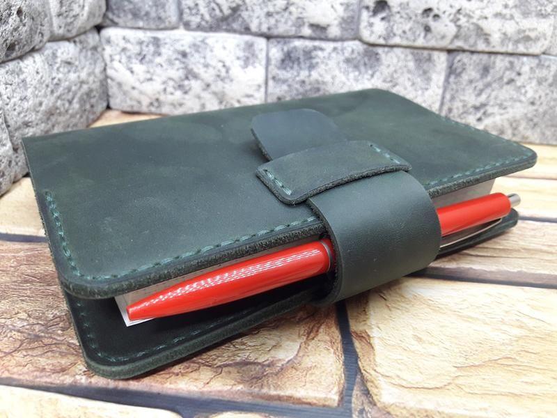 Зелена обкладинка для блокноту формат А6 ручної роботи з натуральної шкіри Crazy Horse завтовшки 1,4-1,6 мм. Обкладинка прошита міцною вощеною 1 мм ниткою. Розмір обкладинки підходить для блокнот стандартні розміри якого 10,5 см*14,8 см*2,3 см. ВАЖЛИВО - якщо Ваш блокнот не потрапляє в ці розміри повідомте, будь ласка, при замовленні. Прослужить Вам не один рік. Дуже гарна річ на подарунок. Можливо виготовлення за індивідуальним замовленням, також можна прошити ниткою іншого кольору. Можливо нанесення Ваших ініціалів або нашого логотипу методом тиснення.
