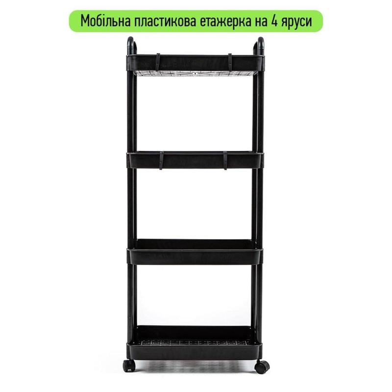 - Етажерка оснащена чотирма пластиковими колесами, які дозволяють легко переміщувати її. Також два колеса мають функцію блокування, яка дозволяє надійно зафіксувати візок у вибраному положенні.