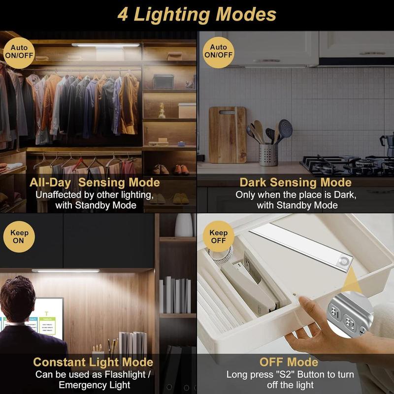 - 【4 режими освітлення】2 режими датчика руху: ①Нічний режим датчика, світло вмикається лише тоді, коли в темряві виявляється людина. ②Режим датчика цілий день, світло вмикається, щойно буде виявлено людину. 2 звичайні режими: ①Індикатор завжди ввімкнено. Можна використовувати як ліхтарик або аварійне освітлення. ②ВИМКНЕНО, коли ви припините його використовувати.