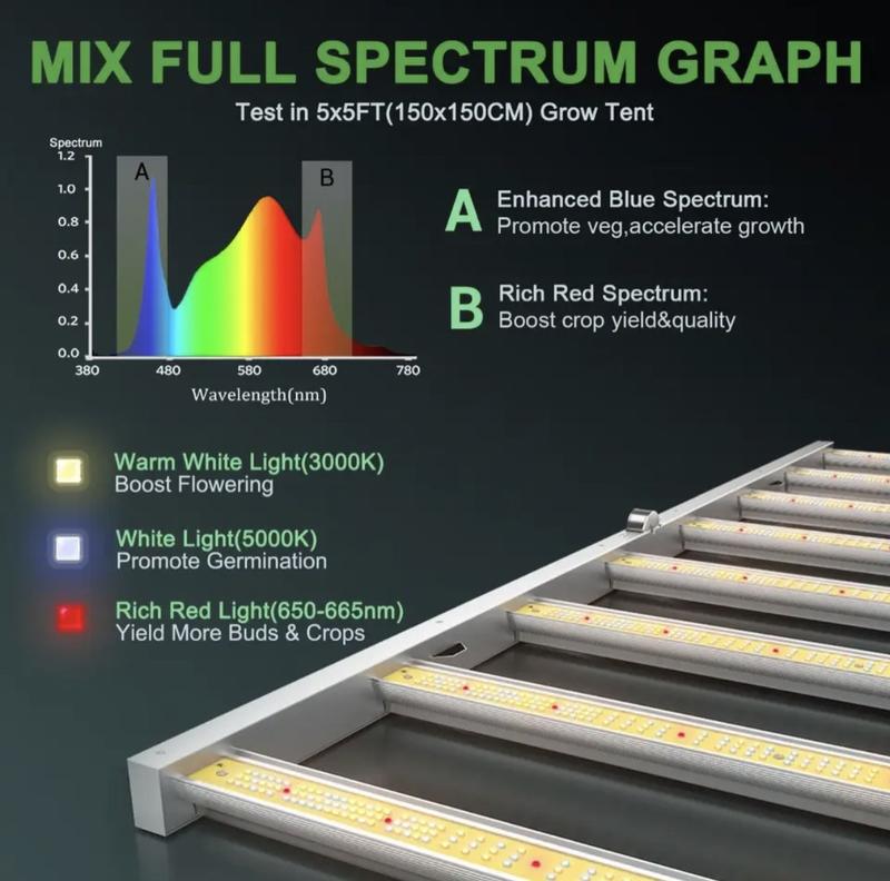 ОБНОВЛЕНИЙ ПОВНИЙ СПЕКТР ОСВІТЛЕННЯ ДЛЯ ЗРОСТАННЯ: високоінтенсивний спектр з посиленим червоним (Samsung 3000K теплий білий + 5000K білий, Osram 660 нм), прискорення цвітіння і плодонос ня великого врожаю, вони підходять для комерційного використання, гроубоксів, кімнат для вирощування, гідропоніки, зростання ґрунту.