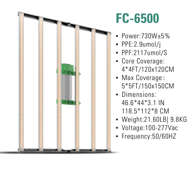 Mars Hydro FC 6500 ефективно замінює 1000 Вт HPS / MH, споживаючи при цьому 730 Вт фактичної потужності. Зона покриття складає 180см x 180см.