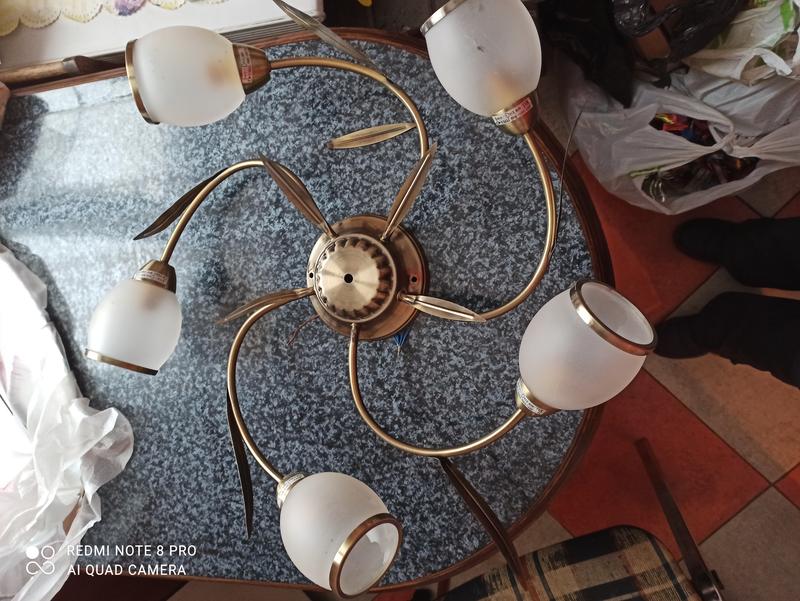 Люстра имеет металлическое основание, к которому прикреплены пять стеклянных матовых плафонов, декорированных золотистой каймой. Плафоны изготовлены в форме цветочных бутонов и направлены в разные стороны, что позволяет осветить все уголки помещения. Для работы люстры необходимо пять лампочек с цоколем Е14 мощностью 60 Вт.