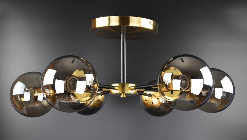 Стельова люстра з 6 плафонами в металевому корпусі. Колір плафонів прозоро-