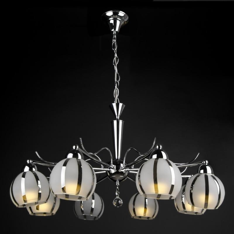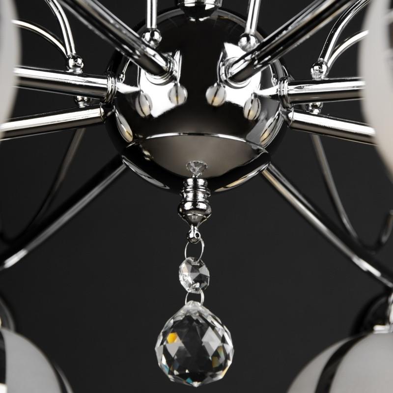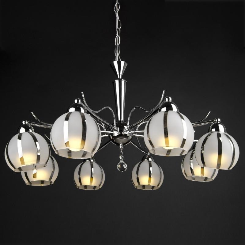і з низькою. Люстра має вісім круглих скляних плафонів з матовим покриттям