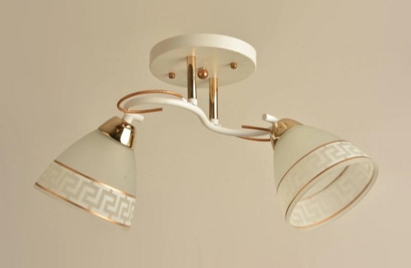 • Стильний білий та позолочений металевий каркас додає благородства, а два скляні плафони створюють м'яке світло для затишної атмосфери.