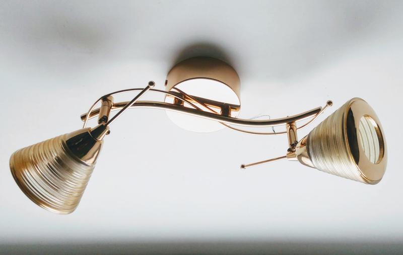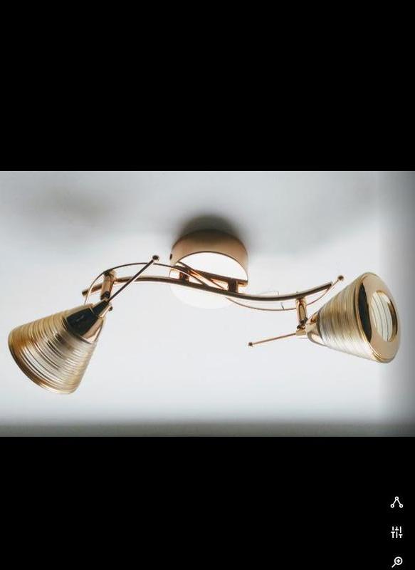 Люстра c поворотними плафонами Матеріал корпусу - метал Матеріал плафонів - скло Покриття корпусу - гальванічне покриття Колір основи - золото Тип цоколя - Е14 або E27 Кількість ламп - 2 --- Пересилаю Укрпоштою або Новою поштою.