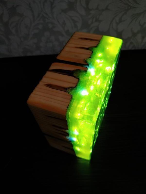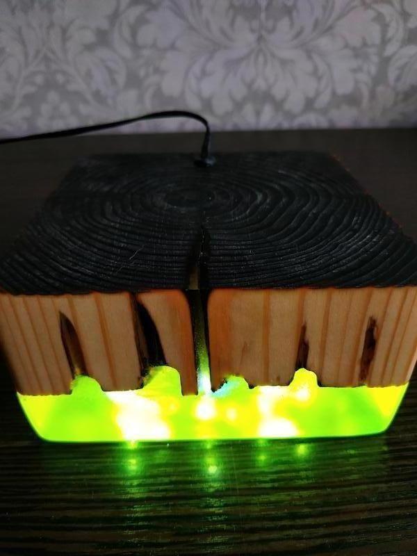 Настільний нічник Vegas модель ручної роботи з натурального дерева, епоксидної смоли і світлодіодним волосіні. Працює від USB. В комплекті кабель USB, блок живлення Дерево оброблено вогнем і лляною олією🔥 Всередині лампи через прозору смолу з смарагдовим відтінком проглядається рельєф выгравированый в дереві, що робить її гарним предметом інтер'єру і при світлі дня...
