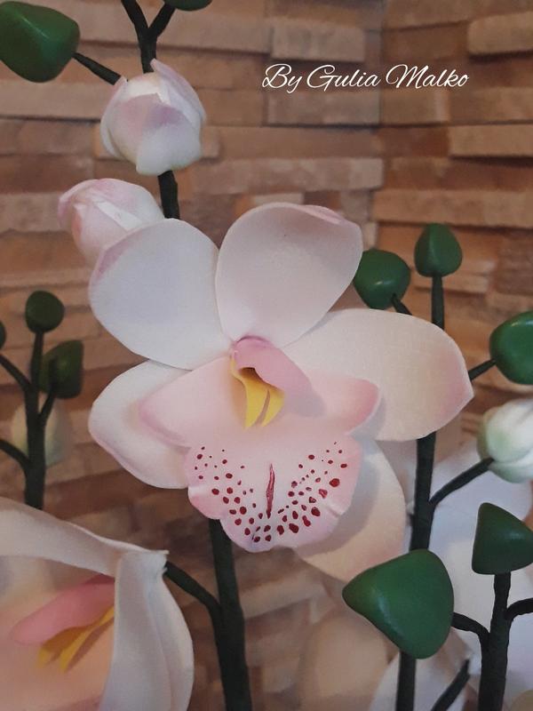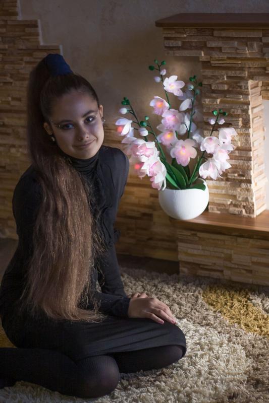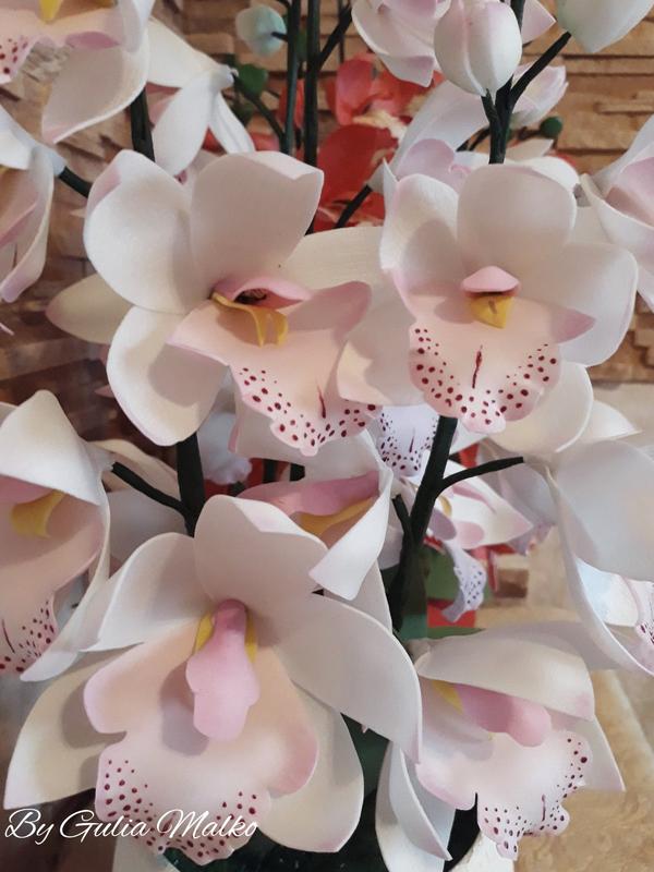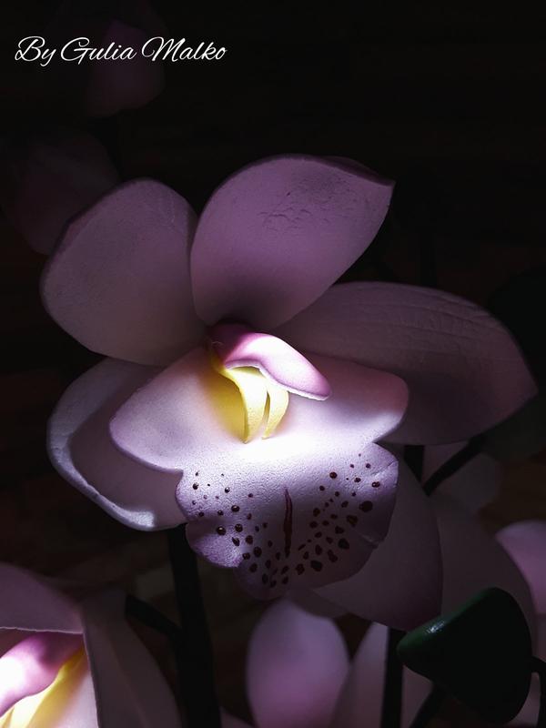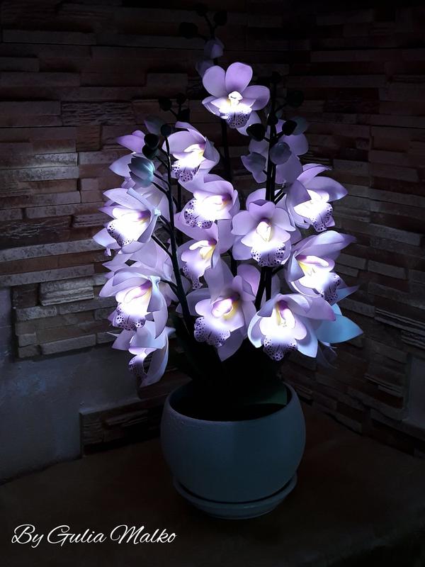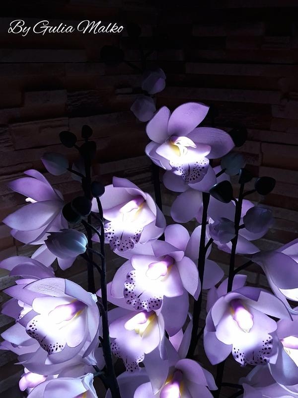 Світильник з фоамирана у вигляді орхідеї "Цимбідіум". Можу виготовити в будь-якому кольорі, вибір кількості гілок і діодів за Вами. На світильнику на фото п'ять гілок і на кожній по п'ять світлодіодів. Термін виготовлення 2 тижні. Ціна вказана за одну гілку. Висота 60 - 65 см, діаметр квітки 6 - 7,5 см, Працює від 220.