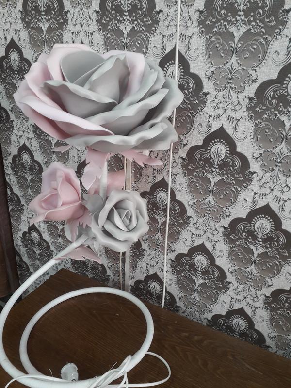 Світильник рожево-сіра троянда-800 грн. Висота 70 см. Світильник-торшер біла троянда – 1200. Висота 110 см. Світильник букет лілвй висота 29см.-700 грн. Світильник із стразами троянда- 1700 Ручна робота. Матеріал ізолон. Не токсичний, без неприємного запаху. Можливе виготовлення під замовлення. На виготовлення йде від 5 до 7 днів, залежно від складності виготовлення. Також виготовляю ростові квіти