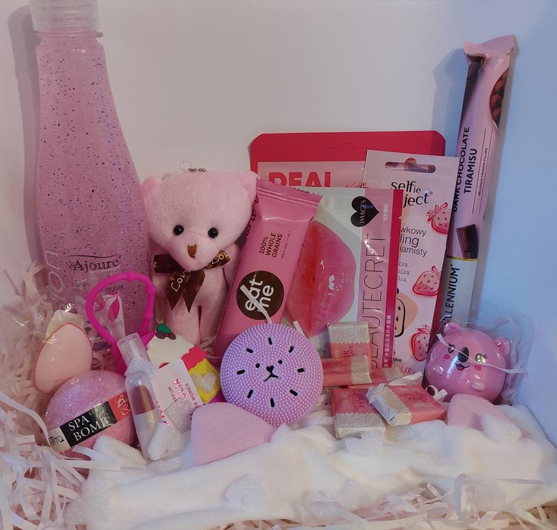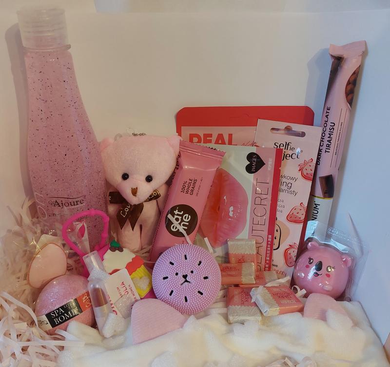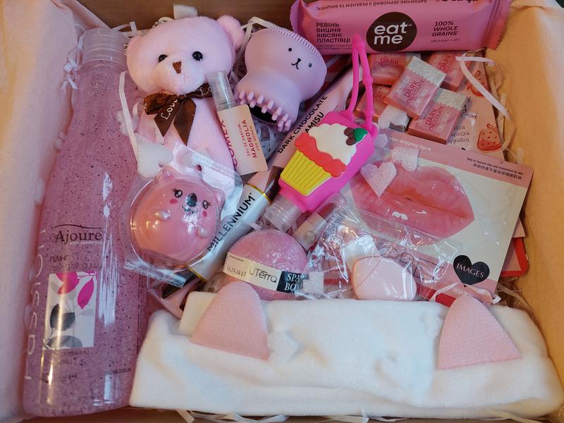 Брелок ведмедик, пов'язка, бомбочка для ванни, бальзам для вуст, помада, патчі для вуст, маска для обличчя, парфуми, пілінг для обличчя, щітка для очищення та масажу обличчя, крем для рук, пілінг-гель для душу, спонжик, солодощі.