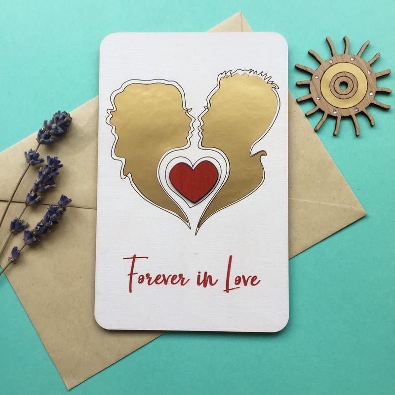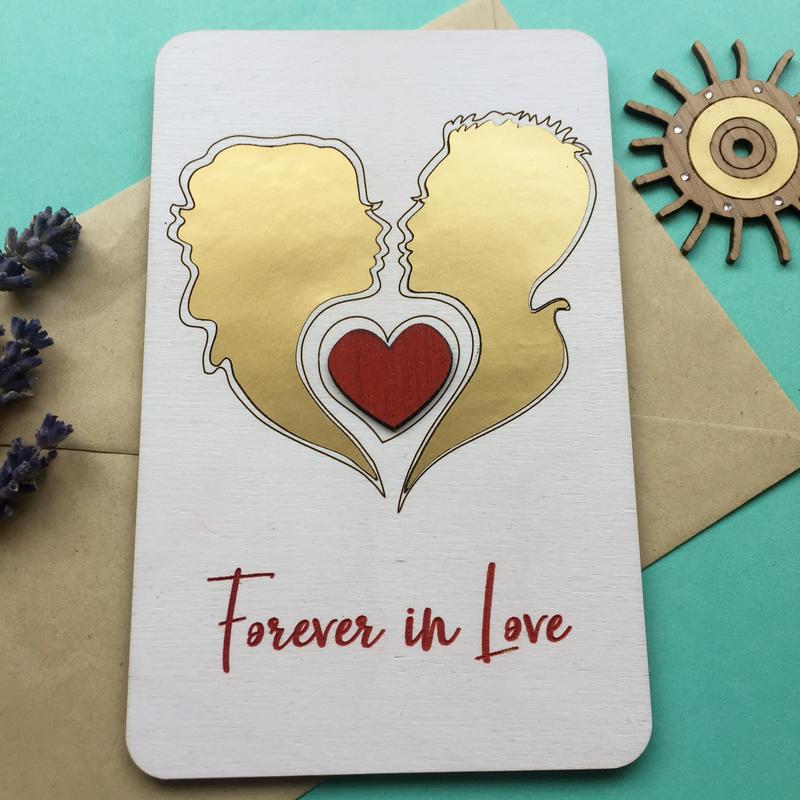 Оригінальна листівка з дерева для закоханихМатеріал: дерево, золота фольга, еко шпон, гравіювання, тонування (червоний)Розмір: 14.5 см х 9 смКонверт у комплекті