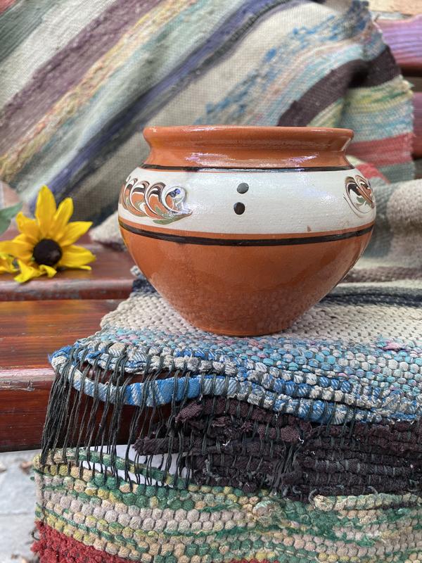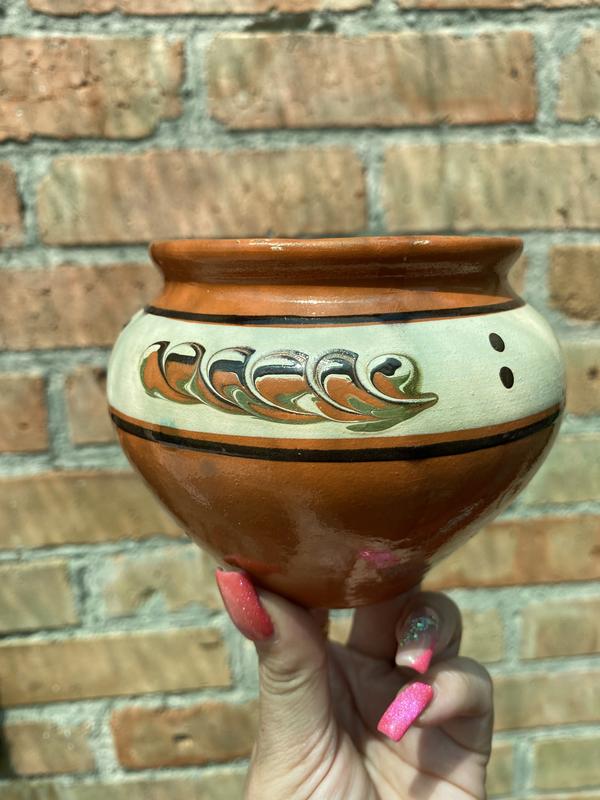Українська самобутність! 🌼 Магія, що проходить через призму ностальгії! Росписной горщик для перших страв або крыночка для напоїв! 🏺Смак їжі з глиняного посуду, не йде ні в яке порівняння із звичайною посудом! Форма і матеріал, з якого виготовлений цей горщик сприяють збереженню автентичності смаку, довго зберігаючи температуру, смак і аромат! До того ж тільки екологічно чиста глина здатна виділити особливості смаку і присмаку продукту! Даний екземпляр - вінтаж, прекрасний зразок центру гончарства - Опішненської кераміки (Опішня Полтавської області). Виготовлений заводом "Художній керамік" в 1980- х роках. Має класичну форму, вручну з любов'ю розписаний орнаментальним обливаним візерунком, обпалена глина покрита карамельної глазур'ю (майоліка)! Глазур має благородну сіточку кракелюра, що підтверджує серйозний вік виробу. Невеликий, як і належить порційному горщику, заввишки 12 см, діаметром функціональної частини - 16 см.