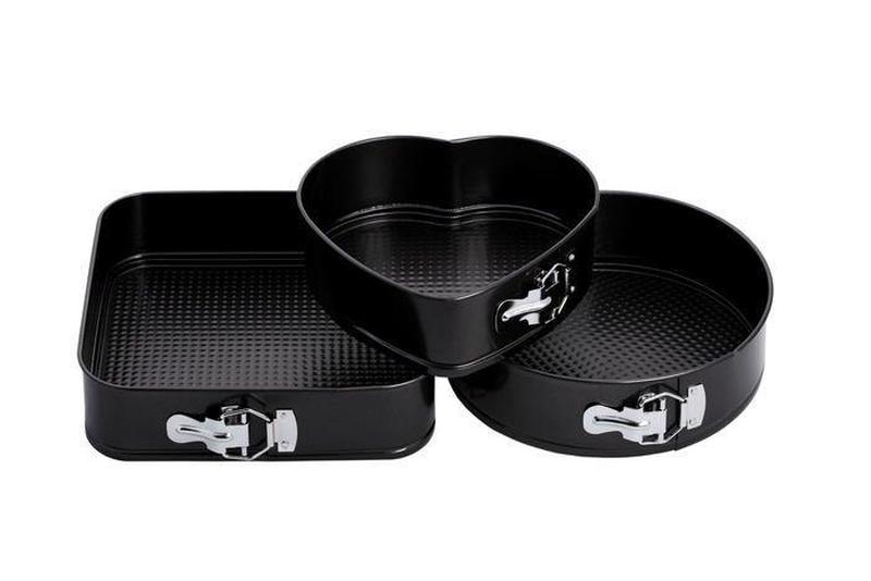 Набір роз'ємних форм для випічки Plot 3 шт - це набір з трьох роз'ємних круглих форм для випічки бісквіта. Виготовлені з високоякісного алюмінію з безпечним антипригарним покриттям. Таке покриття полегшує процес приготування та догляд за посудом. Характеристика: - Матеріал: харчовий алюміній з покриттям - Покриття: антипригарне тефлонове - Форма: кругла, квадратна, серце - Кількість: 3 шт - Колір: чорний - Упаковка: картонна коробка Розміри: - Коло: 26х6,5 см - Серце: 22,5х20х6,5 см - Квадрат: 27х27х6,6 см