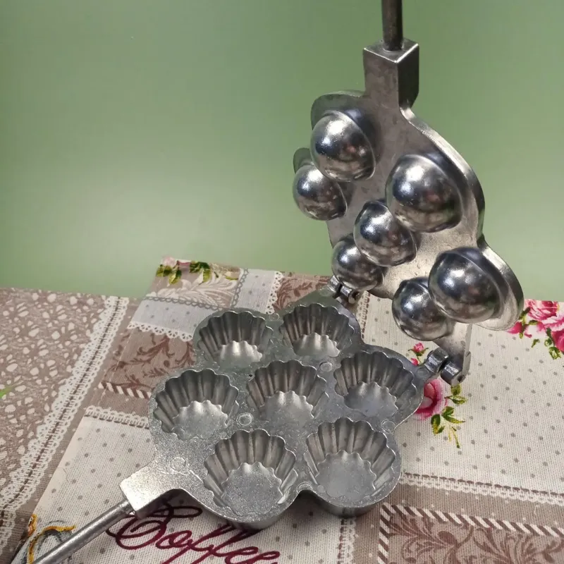 Дорогі друзі, представляю вашій увазі металеву форму для випікання знаменитого печива - "Кошички". Це тарталетки, які можна наповнити будь-якою начинкою. Домашній десерт, що хочеться готувати щодня. Печиво у формі для випікання на газі - проста, але в той же час неймовірно смачна випічка з дитинства. Ця форма була рідкісною знахідкою за часів Радянського Союзу. Усі господині мріяли її купити. Проста у використанні, практична та довговічна форма для випікання тарталеток. Печиво можна випікати як на газовій, так і електричній плиті. Принцип роботи простий: заповнюємо форми тестом і добре прогріваємо з двох сторін на газовій або електричній плиті, тримаючи форму за дерев'яні ручки. Кількість "кошиків", які можна готувати одночасно - 7 штук Стан: новий. Розмір форми: діаметр 16х15 см, довжина з ручками 40 см. Вага 945 грам. Тяжка, міцна, якісна форма, яка прослужить багато років. Ви можете передати її у спадок своїм дітям та онукам. Така форма ніколи не зіпсується. Вона практична та надійна. Матеріал: алюміній. Форма виготовлена із безпечного харчового алюмінію. Форма для випікання печива складається з двох з'єднаних між собою частин. Для зручнішого використання передбачені зручні дерев'яні ручки. Пропоную вам спробувати приготувати солодкі «тарталетки-кошики» за старовинним рецептом. Інгредієнти для тесту: 250 г маргарину (можна замінити олією або спредом), 2 ст. л. свинячого сала (можна замінити рафінованою олією), 500 г пшеничного борошна + 1,5 год. л. розпушувача для тіста, 1/3 год. л. солі потрібно розтерти у крихту. Окремо змішати 4 жовтки зі 170 грамами цукру, додати ванільний цукор. Вилити цю суміш у тісто. Замісити м'яке тісто. Залишити у холодильнику на годину. Зробити кульки розміром із волоський горіх (приблизно 15 грамів). Форму потрібно змастити олією та заповнити тестом тільки з одного боку. Закрити форму і випікати на газовій плиті по 2-3 хвилини з кожного боку (до золотистої скоринки). Наповнити тарталетки можна будь-якою начинкою: збитими білками, джемом, ягодами, вареним згущеним молоком, вершками або заварним кремом. Смачно!