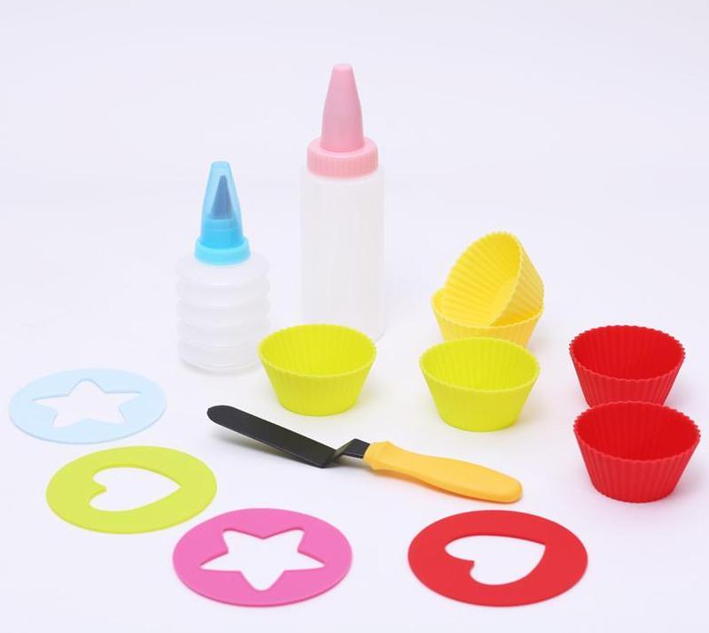 Набір для випікання Young Chef для наймолодших кулінарів. У виробництві набору використовується високоякісний харчовий силікон із температурним діапазоном від -40 °C до +230 °C. У наборі все необхідне для процесу випікання:• 4 силіконові форми для випікання кексів або мафінів класичної форми; • 4 трафарети для декорування випічки; • 2 пластикові баночки з насадками для декорації; • кулінарний шпатель, який також може використовуватися як лопатка. Усі вироби можна мити в посудомийній машині.