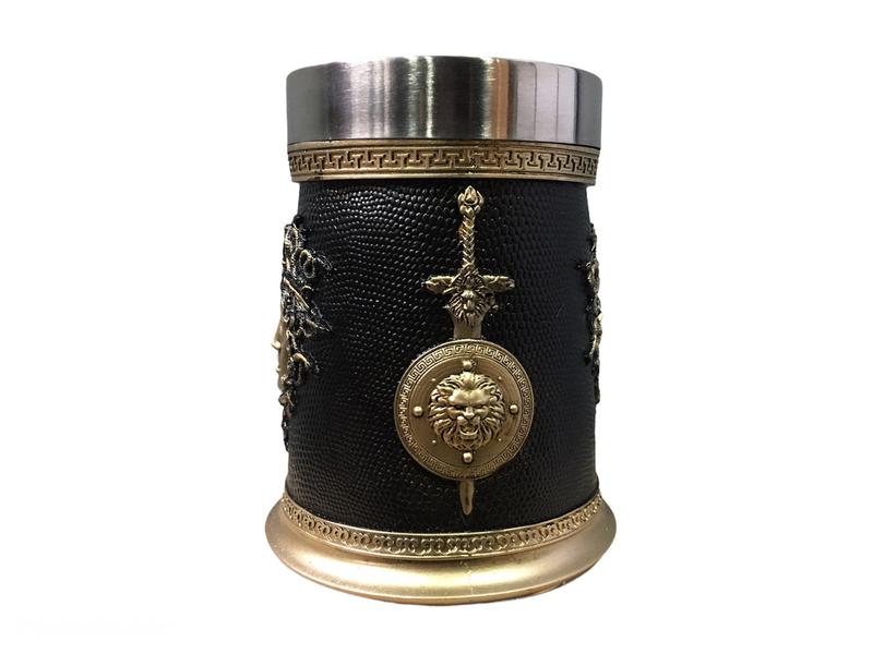 Кружка прикрашена ін. німецькими візерунками з молотами Тора і рунічних колом,
