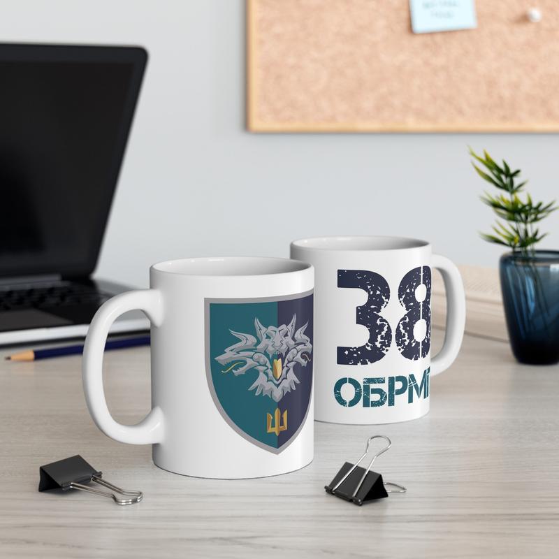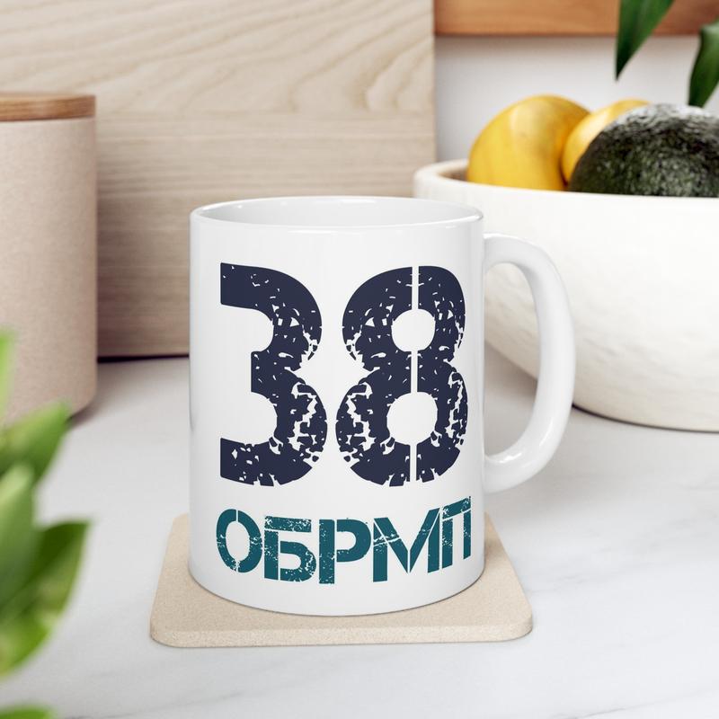 - Дизайн: На кружці зображений офіційний шеврон "38-та окрема бригада морської піхоти" з детальним відтворенням кольорів і елементів.