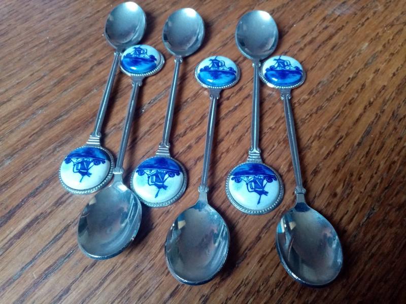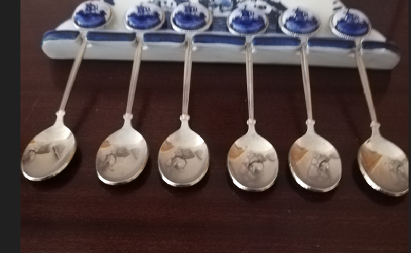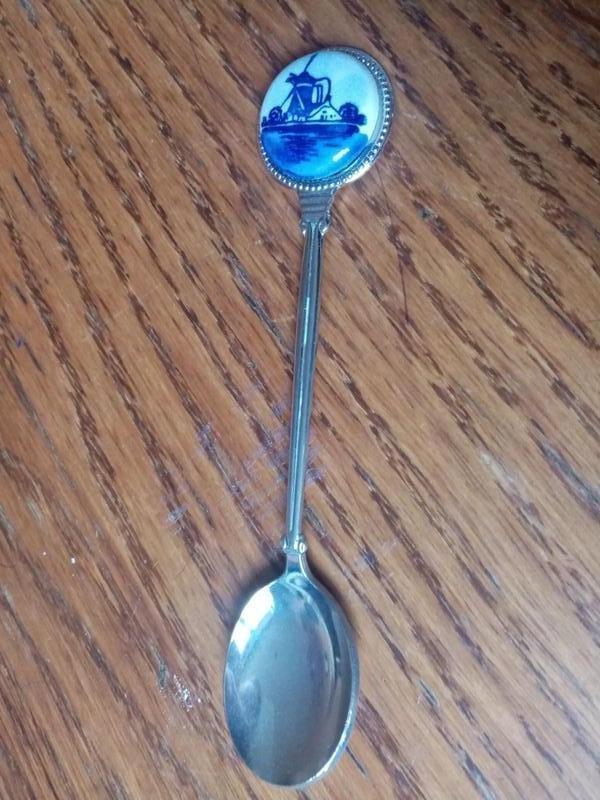 Ложка сувенирная "Мельница" Голландия6 штукфарфоровая вставка с изображением мельницы на черенке ложкикобальтжемчужное рельефное обрамление фарфоровой вставкина черенке рельефный узорвинтаж 70годыцена 330грн за 1 ложку