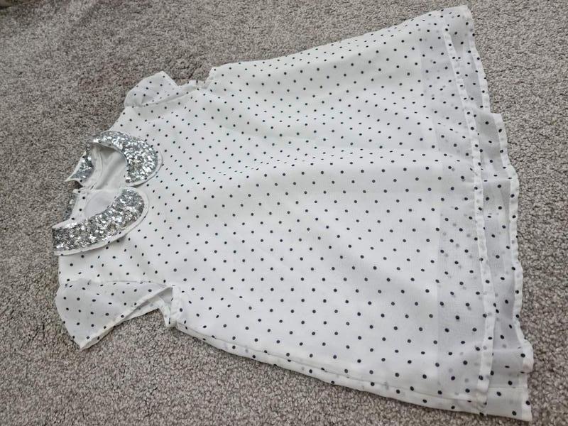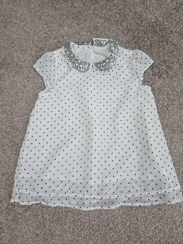 Продам нарядную фирменную блузу в школу для девочки на рост 134- 140 см. Цвет белый в темно- синий горох, ворот красиво расшит серебристыми пайетками. Одевалась всего й раз. Состояние новой! Замеры по требованию, пересылаю после оплаты.